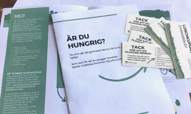 Med anledning av coronapandemin studerar Sveriges gymnasieelever just nu hemifrån. Som tack för att de pluggar hemma och på så vis bidrar till minskad smittspridning bjuder Grästorps kommun de elever som bor i vårt område på sju luncher på ortens restauranger. Lunchkupongerna skickas ut per post, tillsammans med matnyttig information om våren och den stundande sommaren. pdf, 406.1 kB.