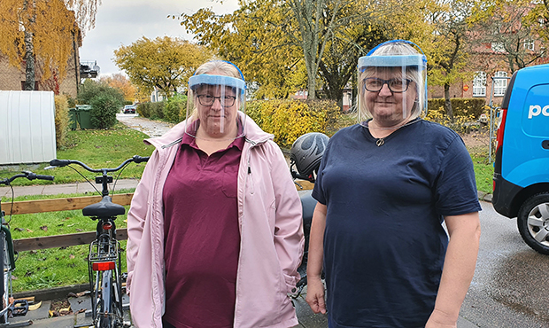 Men vi kan förstå att det ser lite misstänkt ut, lite farligt nästan, när man kommer gående ute i samhället med visir på, fortsätter Helene Persson, som också arbetar som personlig assistent i Grästorps kommun. Men ingen som är sjuk är ute och går, då är man hemma i karantän.
