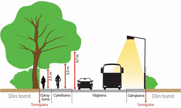 Tänk även på att grenar inte får växa ut över gång- och cykelbana eller gata samt att i gatuhörn