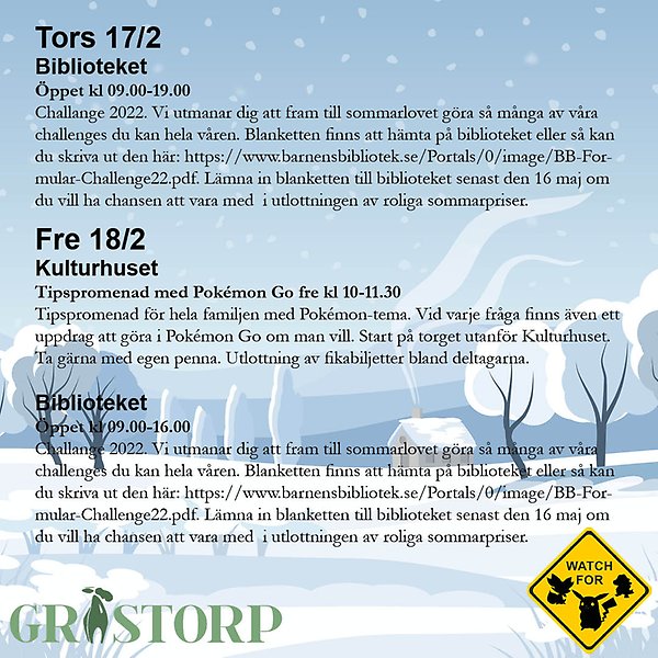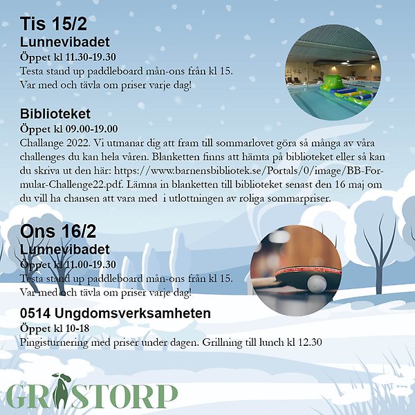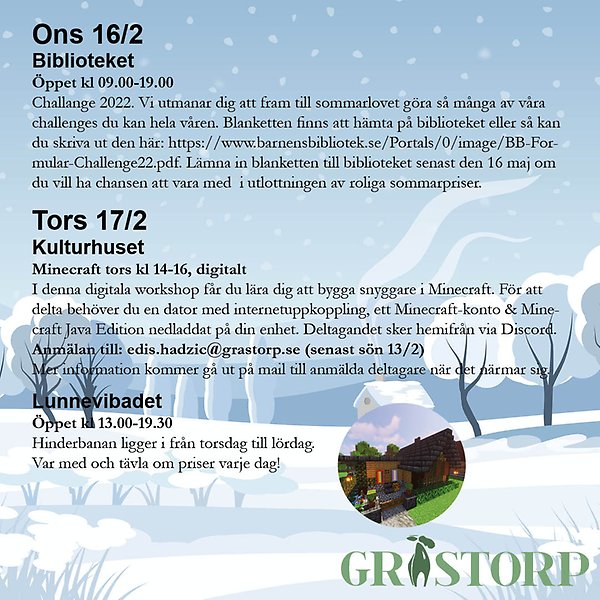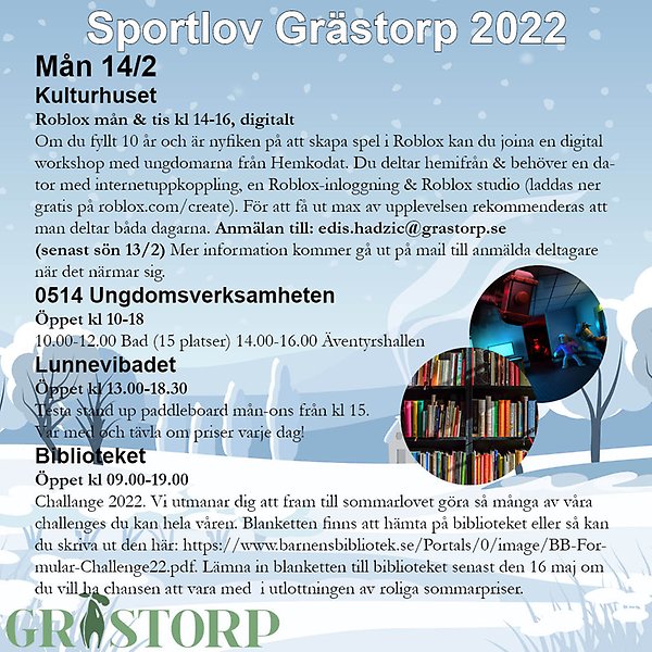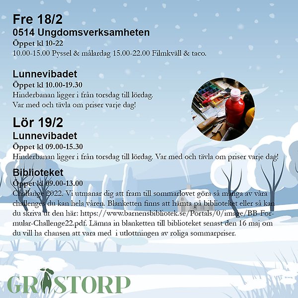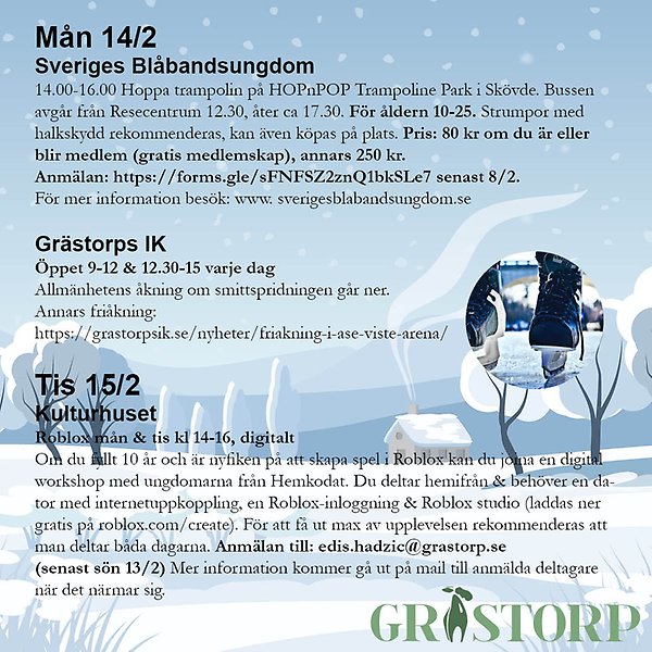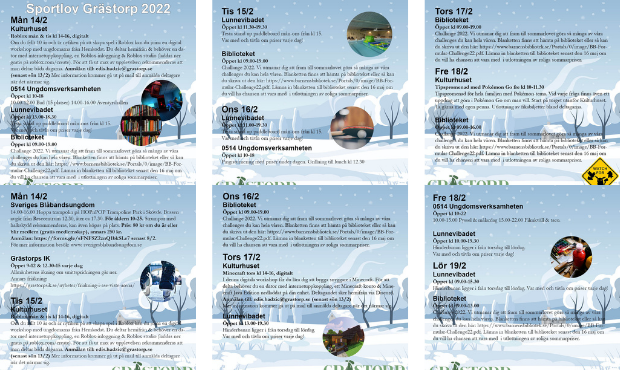 Det här händer i Grästorp på sportlovet, fullt med härliga aktiviteter! Glöm inte att anmäla er i tid till aktiviteterna som kräver föranmälan.