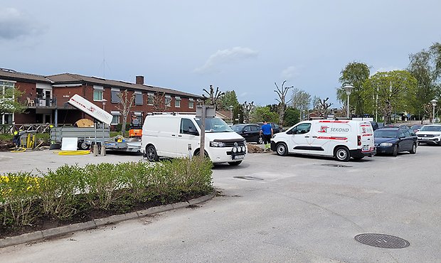 Just nu är det trångt på parkeringen framför kommunens hus då laddstolpar till hemtjänstens nya bilar installeras.
