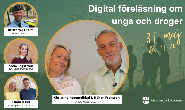 Drogförebyggarna Håkan Fransson och Christine Hummelblad kommer att prata om hur drogläget ser ut bland unga idag och hur man som förälder och viktig vuxen i en ung persons liv kan göra för att skapa en tonårstid fri från alkohol, tobak och narkotika. En viktig del i det drogförebyggande arbetet handlar om att få alla vuxna överens om nolltolerans kring ungas drogande.