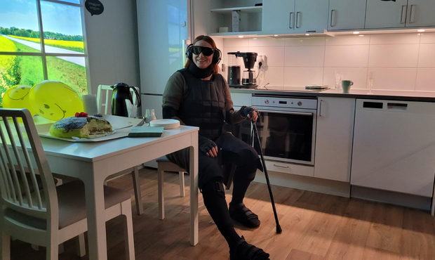 I lärmiljön kan personal prova äldredräkten som simulerar vanligt förekommande begränsningar som äldre drabbas av. Madeleine Vinberg (C) fick prova äldredräkten som gav henne känslan av artros i ena knäet, stela leder, tyngdväst, skor som ger obalans, glasögon som ger samma synfel som vid diabetes.
