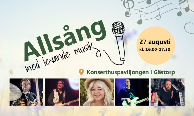Värm upp sångrösten och ta med dig familjen eller vännerna på en härlig sensommar-allsång som kommer bjuda på många olika trevligheter. Allsångsbandet står redo på scenen med Peter Friestedt på gitarr, Bengan Andersson på trummor, Bas-Berra Holmgren på bas, John Lönnmyr på piano och Inger Nordström som allsångsledare.