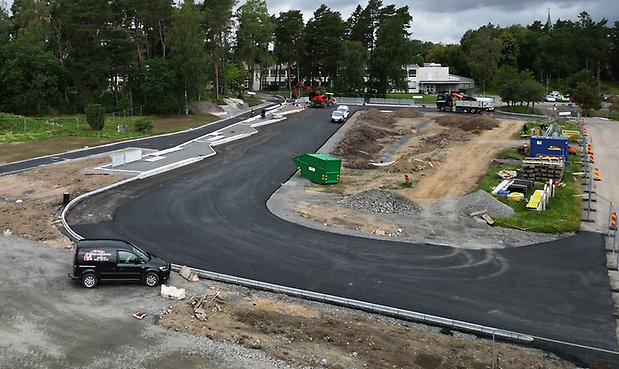 "Nu återstår bland annat att svetsa räcken, att asfaltera Äventyrsvägen och den breddade utfarten och så ska det läggas specialasfalt där bussarna ska stå, och den kan bara läggas i torrt väder," förklarar David Edvardsson, projektledare i Grästorps kommun.