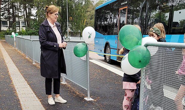 "En mycket säkrare skolskjutsplatsplats för eleverna, och en frigjord yta vid Lunnevi för alla verksamheter som är samlade runt det området" - så sammanfattade kommundirektör Eva Dahl den nya skolskjutsplatsen när morgonens första elever klev av Frambo-bussen.