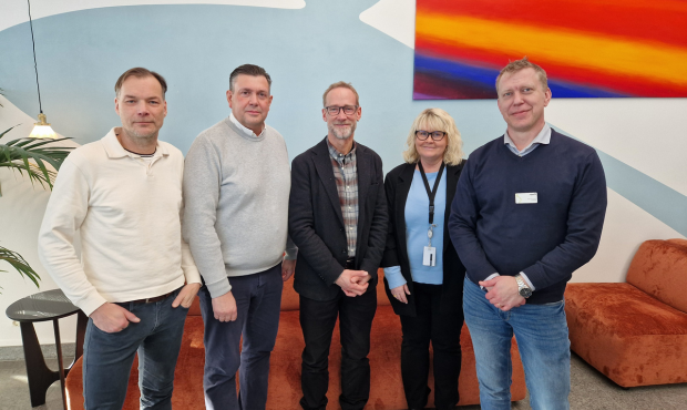 Från vänster: Fredrik Edholm, IT-strateg på Skaraborgs kommunalförbund, Hans Ekensskär, socialchef på Grästorps kommun, Sverker Andersson, socialchef på Vara kommun, Lena Ludvigsson, enhetschef på Skaraborgs kommunalförbund, Rikard Strömqvist, socialchef på Tibro kommun (Foto: Robin Alm)