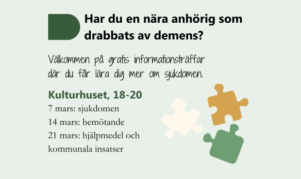 Grästorps kommun erbjuder dig att vara med på tre kostnadsfria träffar. Här kan du få mer kunskap om demenssjukdomar så att du bättre kan stötta och förstå den som fått sjukdomen.