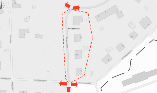 Från och med måndag den 6/5 kommer vi att stänga av ett område på Tengenevägen på grund av arbete och utbyggnad av VA-nät. Arbetet kommer att pågå i flera veckor och ske i samband med fjärrvärmebyte på grund av läckage.