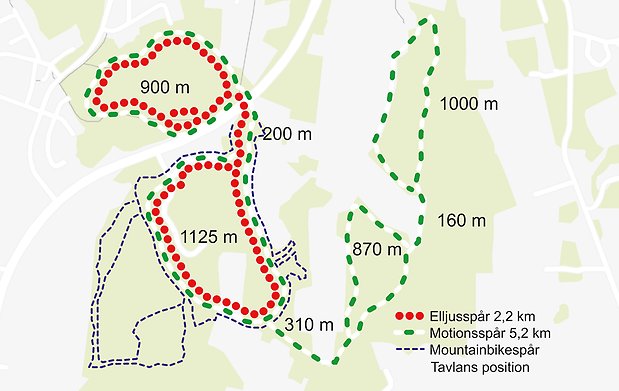 Röd färg visar den belysta slingan som är 2,5km, grön färg visar den längre slingan